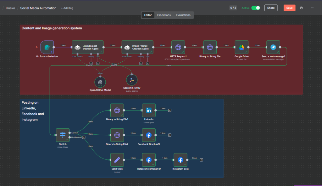 Tools used: n8n, ChatGPT API, AI agents, Tavily, Telegram, Facebook, Instagram, LinkedIn